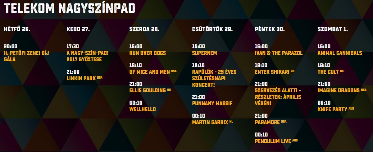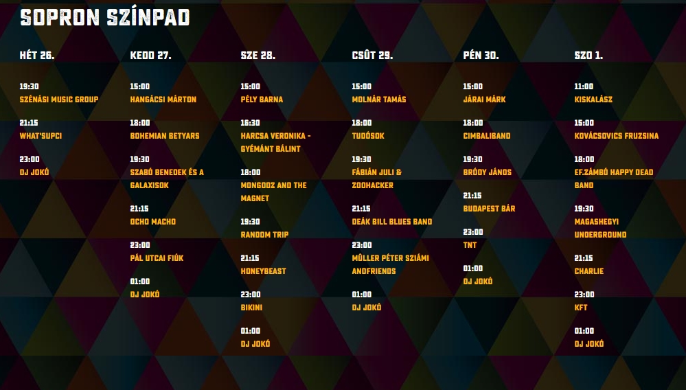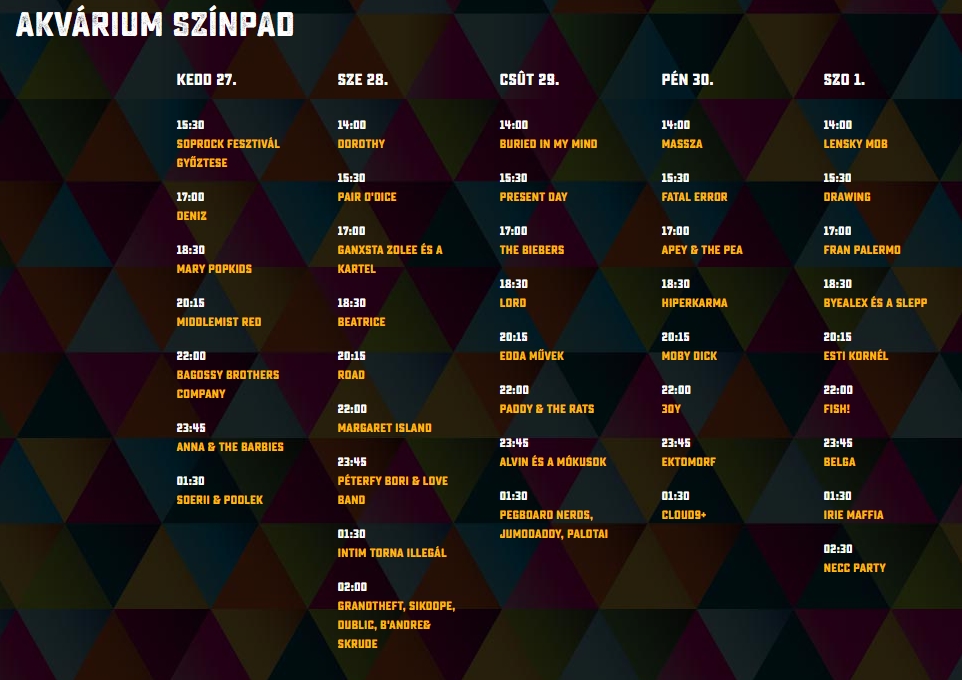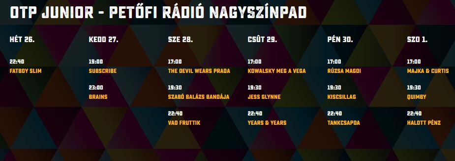 30y, Alvin és a mókusok, Andro, Anna & The Barbies, Apey & the Pea, Babé Sila, Bagossy Brothers Company, Beatrice, Belau, Belga, Bikini, Blahalouisiana, Bohemian Betyars, Bródy János, Budapest Bar, Charlie, Cimbaliband, Cloud 9+, Deák Bill Blues Band, Deniz, Dorothy, Edda, Ektomorf, Esti Kornél, Fatal Error, Fábián Juli & Zoohacker, Fish!, Freddie, Ganxsta Zolee és a Kartel, Halott Pénz, Harcsa Veronika és Gyémánt Bálint, Hiperkarma, Honeybeast, Intim Torna Illegál, Irie Maffia, Ivan & The Parazol, Jetlag, Kelemen Kabátban, KFT, Kiscsillag, Kowalsky Meg A Vega, Lord, Luckies, Magashegyi Underground, Majka & Curtis, Margaret Island, Marge, Mary Popkids, Metzker Viktória, Middlemist Red, Moby Dick, Mongooz and the Magnet, Mystery Gang, Newl, Ocho Macho, Odett, Paddy And The Rats, Pair O' Dice, Pál Utcai Fiúk, Péterfy Bori & The Love Band, Poli, Punnany Massif, Quimby, Random Trip, Road, Run Over Dogs, Sikztah, Soerii & Poolek, Soulwave, Sterbinzsky, Supernem, Szabó Benedek és a Galaxisok, Tankcsapda, The Biebers, TNT, Tudósok, Vad Fruttik, Wellhello, ...